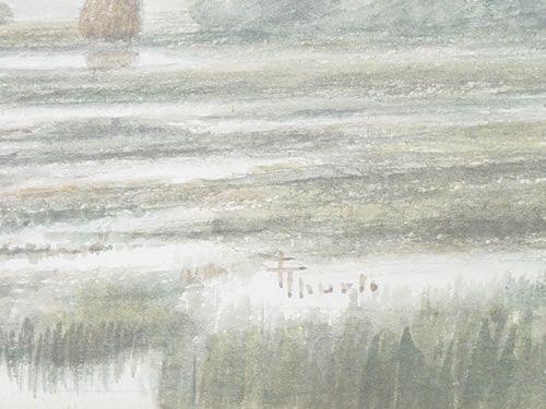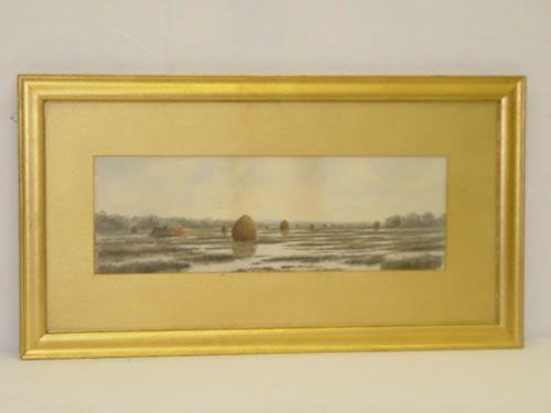 WATERCOLOR HAYSTACKS IN NEWBURYPORT SIGNED F. THURLO (FRANK THURLO), FRAMED & MATTED (6" X 18 1/2")