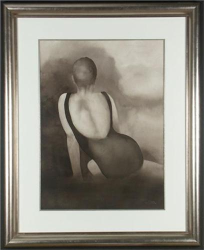 WATERCOLOR ON PAPER 29'' x 21 1/2'', J. Cox. A woman in a swim suit. Signed lower right corner. Late 20th century. Placed in a silvertone frame.