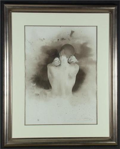 WATERCOLOR ON PAPER 29'' X 21 1/2'', J. Cox. A woman's back with hands. Signed lower right corner. Late 20th century. Placed in a silvertone frame.