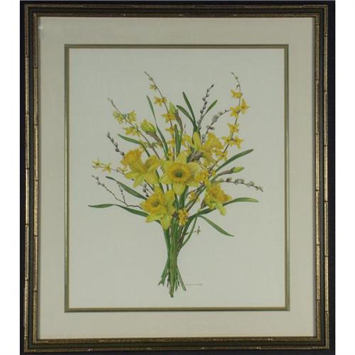 WATERCOLOR ON PAPER 24'' x 20'', Charlotte Ann Meckley. A Botanical Drawing of Daffodils. Signed lower center. Triple matted and placed in a faux bamboo frame.
