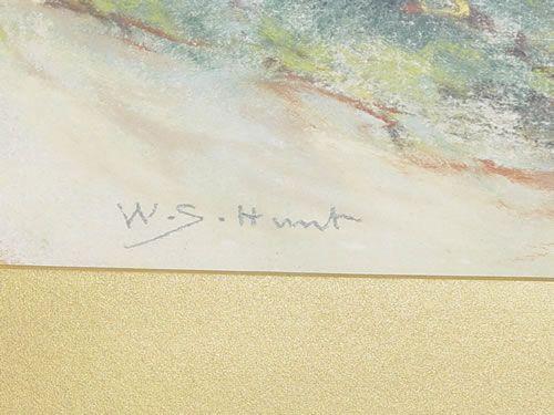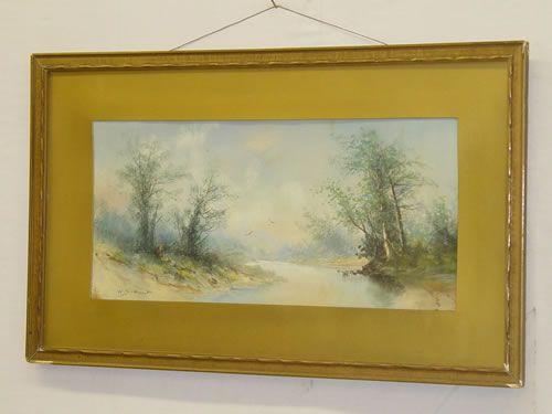 WATERCOLOR OF WOODLAND RIVER SCENE SIGNED W.S. HUNT ON LOWER RIGHT, FRAMED & MATTED (8 3/4" X 18 3/4")