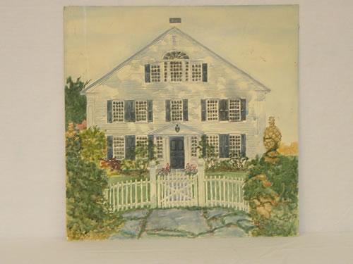 WATERCOLOR ON ARTIST BOARD OF A LARGE HOME W/ FENCE & GARDEN MARKED ON BACK "THE HOMESTEAD" SIGNED LORAINE CHALIFOUX, UNFRAMED (20" X 20") - MACLEISH PRESENTATION ON BACK, SOILING, DRIP LINES, IMPERFECTIONS