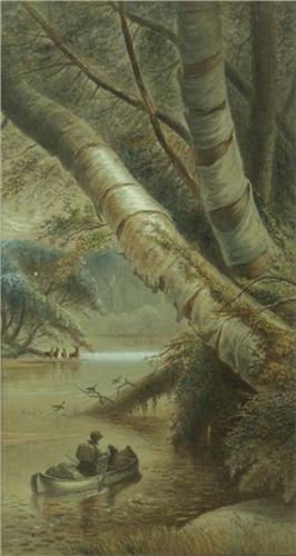 WATERCOLOR ON BOARD 18 1/2'' X 10''. Man in a canoe on a heavily wooded river. Signed with initials ''H.D.'' and dated ''1880'' lower right corner. Note small spot of water damage on lower right side. Placed in a wood frame.