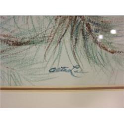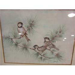 WATERCOLOR PAINTING OF SPARROWS. Depicts 3 sparrows on tree branches in winter scene. Signed in lower right "? Lee". 25" x 21" framed.