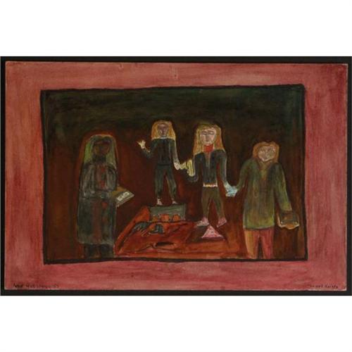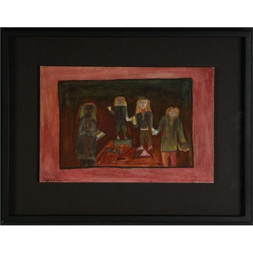 WATERCOLOR ON BOARD, Pehr Hallsten (d. 1965), WA. ''Street Saints''. Signed and dated ''53'' lower left. Titled lower right. Floating presentation in a black frame. More info. at the front desk. 10'' x 15''/ 16.5'' x 21.25'' framed.