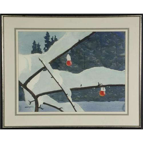 WATERCOLOR ON PAPER, Perry Acker (1903-1989), WA. ''Crabapples a la Mode''. Signed and dated ''80'' lower left. Artist info. on the verso. Triple matted and placed in a simple wood frame with silver trim, frame as seen. More info. at the front desk. 20.5'' x 27''/ 29'' x 35.75'' framed.