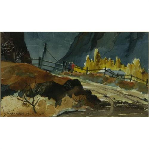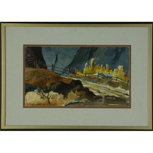 WATERCOLOR ON PAPER, Perry Acker (1903-1989), WA. ''Ellensberg Canyon''. Signed lower left. Titled and dated ''5/88'' on the verso. Additional artist info. on the verso. Double matted and placed in a metallic frame. More info. at the front desk. 8'' x 14''/ 14.25'' x 20.25'' framed.