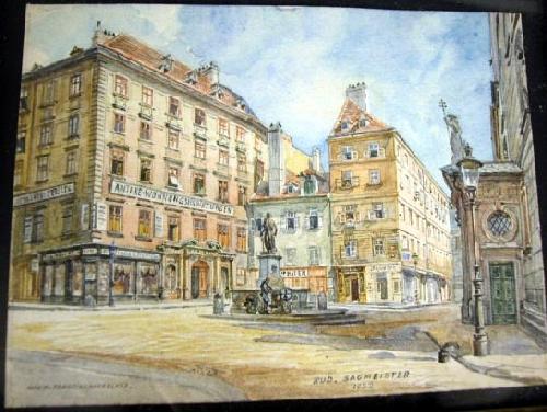WATERCOLOR, RUDOLF SAGMEISTER (AUSTRIAN, 20TH CENTURY); depicting European street scene, signed and dated, lc, "rud. Sagmeister, 1922", "wein.Franciskanerplatz", framed, 3 1/2"h x 4 3/4"w
