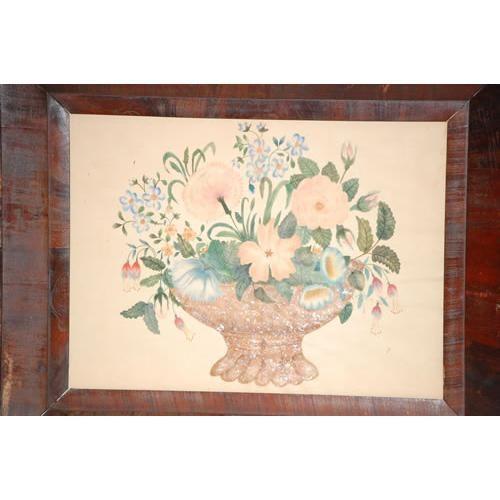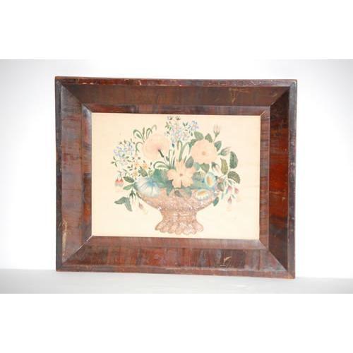 WATERCOLOR THEORUM OF SUMMER FLOWERS IN A BROWN URN W/ MICA FLECKS-UNSIGNED IN AN EMPIRE MAHOGANY FRAME (11 1/2" X 15 1/2") - TONING, FRAME SCRATCHES, IMPERFECTIONS