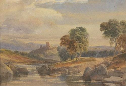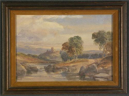 WATERCOLOR ON PAPER 8 1/4'' x 12'', Signed with initials ''W.L.L.'' A castle on the river. Signed and dated ''1856'' lower right corner. Placed in a wood frame with rust-colored velvet matting. Framer's paper label on the verso.