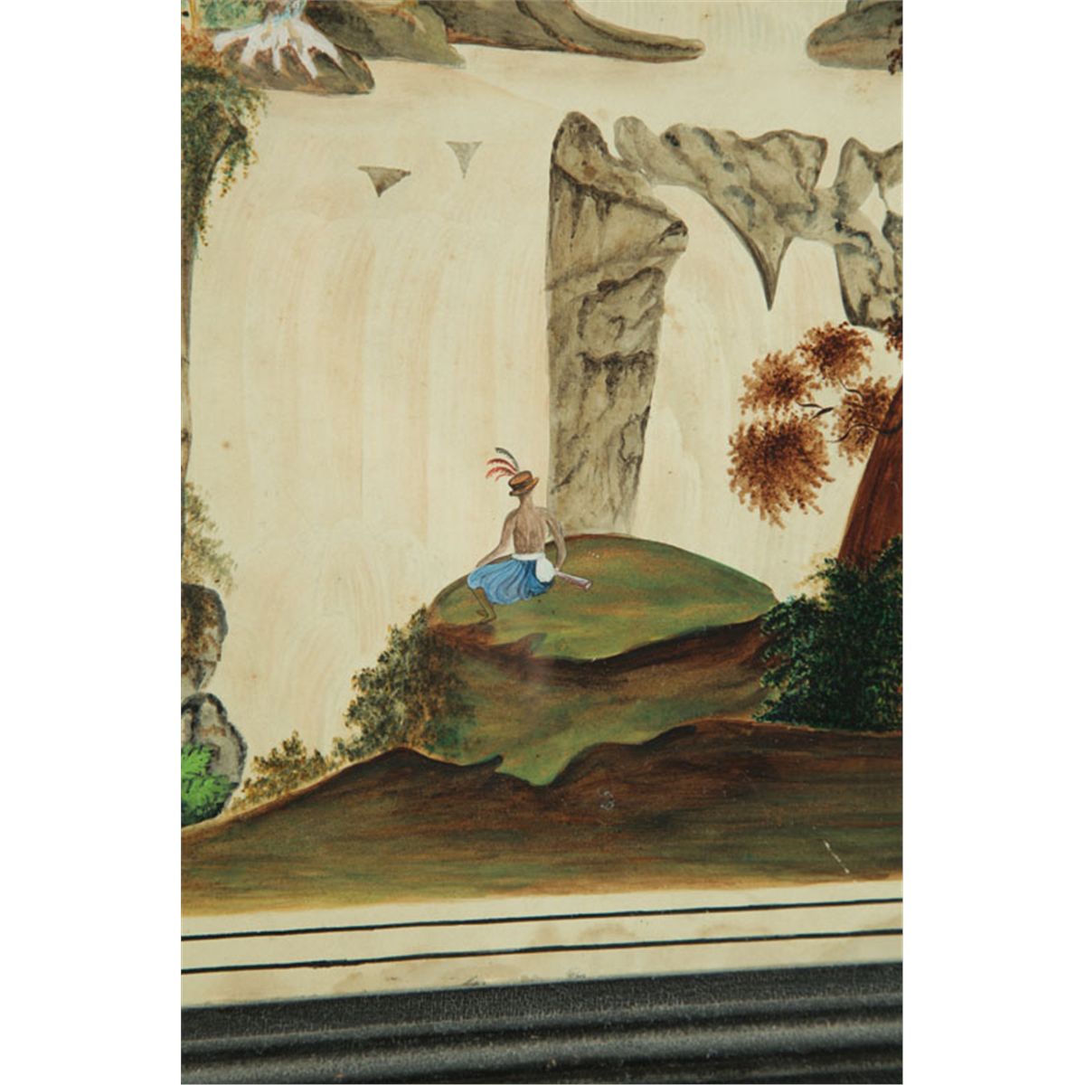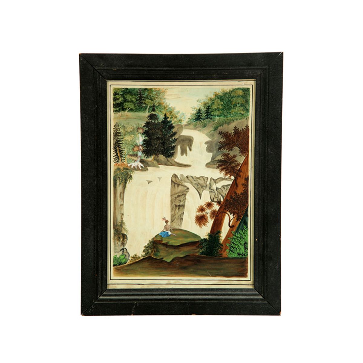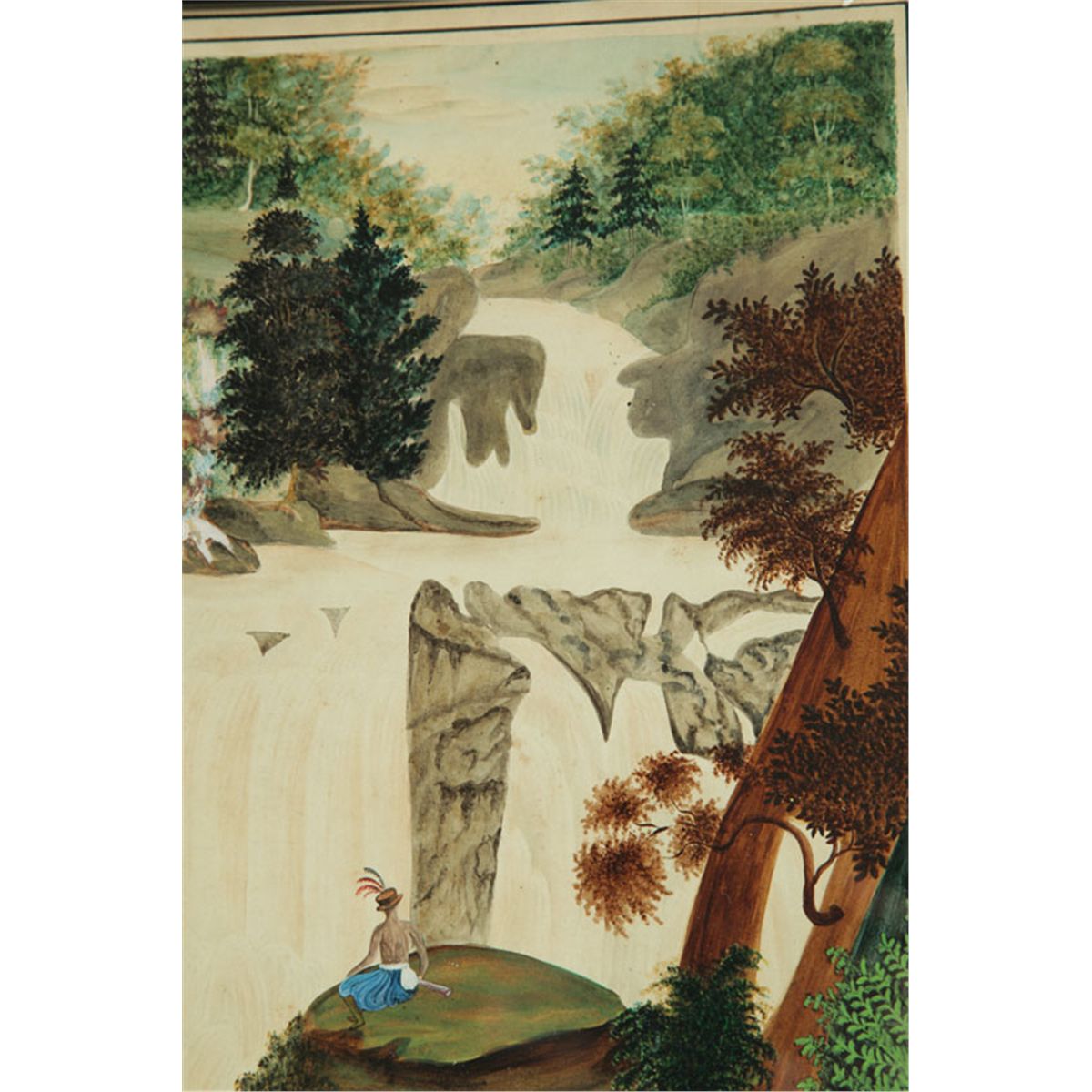 Watercolor on paper, unsigned. Charming, nanve landscape depicting stylized image of an American Indian sitting near a large waterfall. Period frame, 17"h. 13"w.