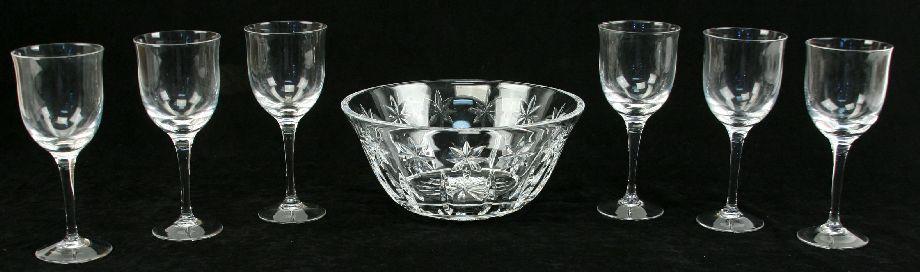 A 9 inch diameter Waterford Betsy Ross collection crystal bowl with original box and a set of (6) 7 inch Noritake crystal goblets. Very good condition.