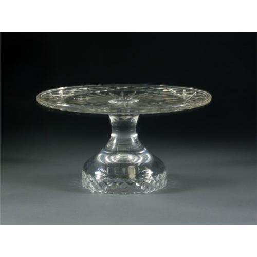CRYSTAL: An unidentified attractive Waterford crystal footed cake plate, 9 1/2'' W x 5 1/8'' with elongated diamond and wedge cut on the plate surface. The footed portion is plain and has the looks of an inverted dome with the base edge being quilt or diamond wedge cut, original sticker remains affixed, early 1950's.
