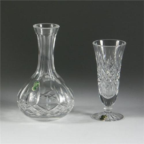 CRYSTAL: A lot of two Waterford crystal pieces, both signed, and having the original Waterford labels, one being a narrow mouth carafe 8.25'' H, in the ''Lismore'' style and the other a open mouth posy vase 7'' in the ''Alana'' style. Note: some surface flea bites on the carafe and minor rub marks.