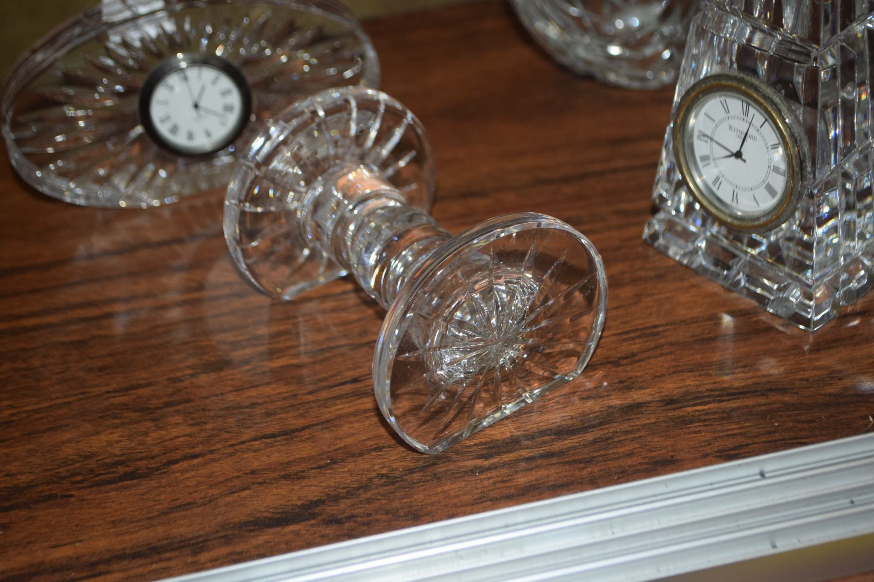 WATERFORD CRYSTAL CLOCKS, KNIFE REST & WATERFORD CIGAR ASHTRAY (4 PCS)