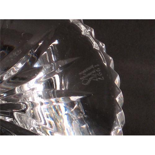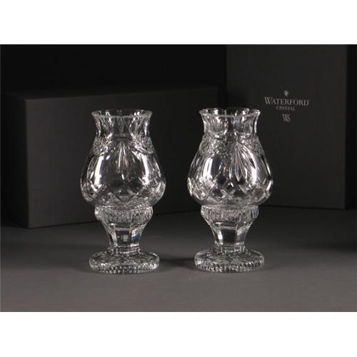CRYSTAL: A pair of Waterford Society Private Collection 1977 Penrose Hurricane crystal lamps, third edition, made exclusively for members of the Waterford Society, signed Waterford and the artist's name Paul Farrell. These Hurricane Lamps are still in their original lined boxes and stand 9'' H including footed base. Each piece is highly cut to include shell, quilt, channel, and star patterns. Mint condition.