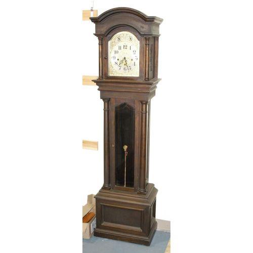 WATERURY CHIMING MAHOGANY TALL CLOCK, with 3 weights, early 20th century, CONDITION REPORT: generally good. unusual model with weights supported by metal tape or bands rather than cable.