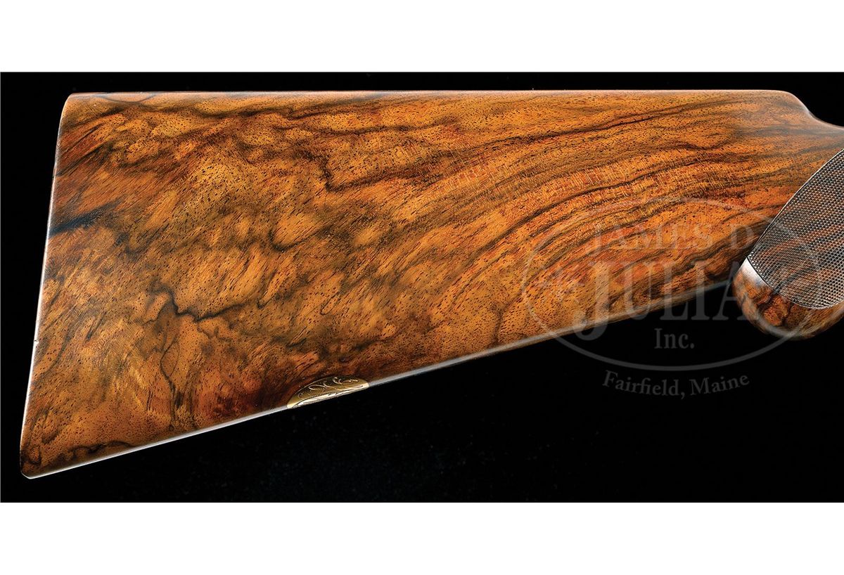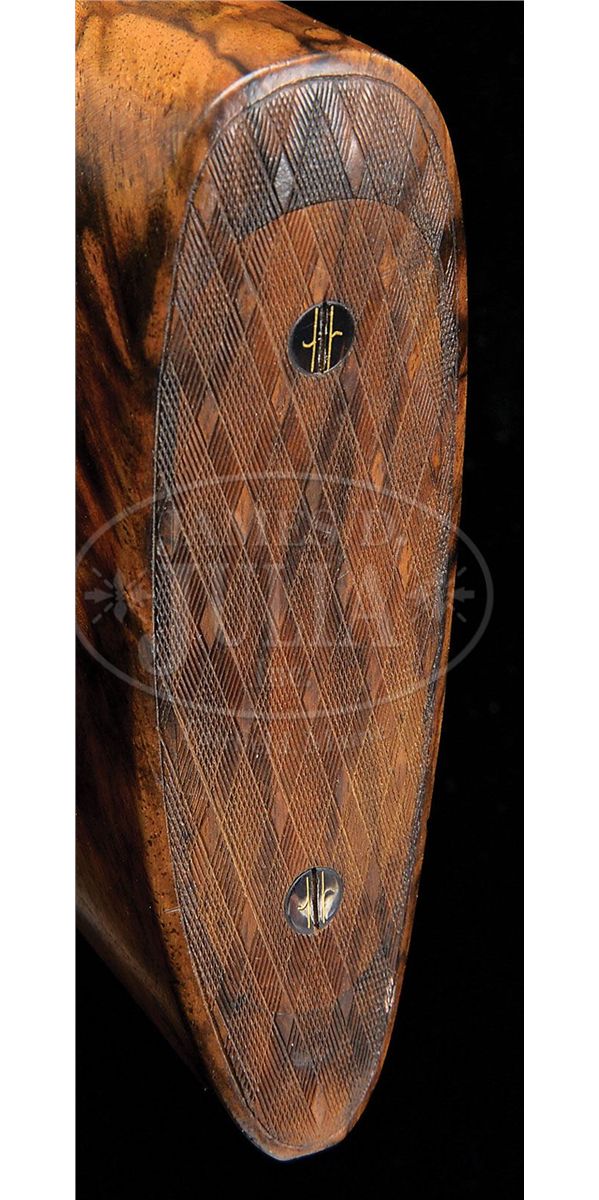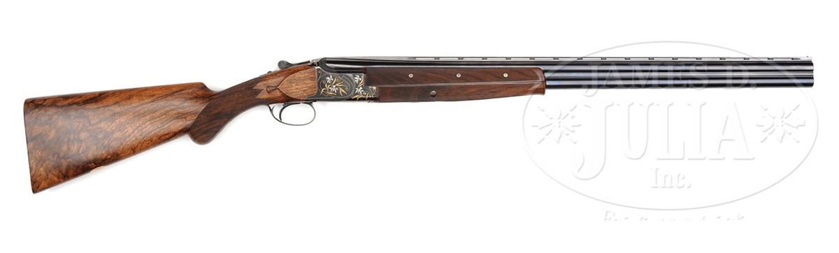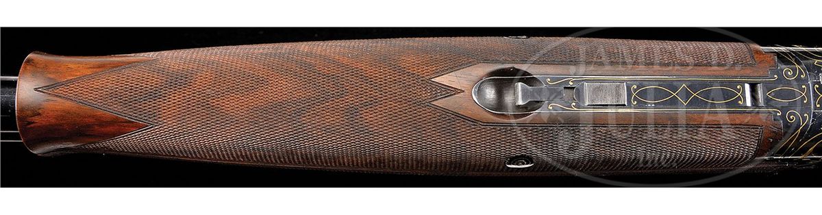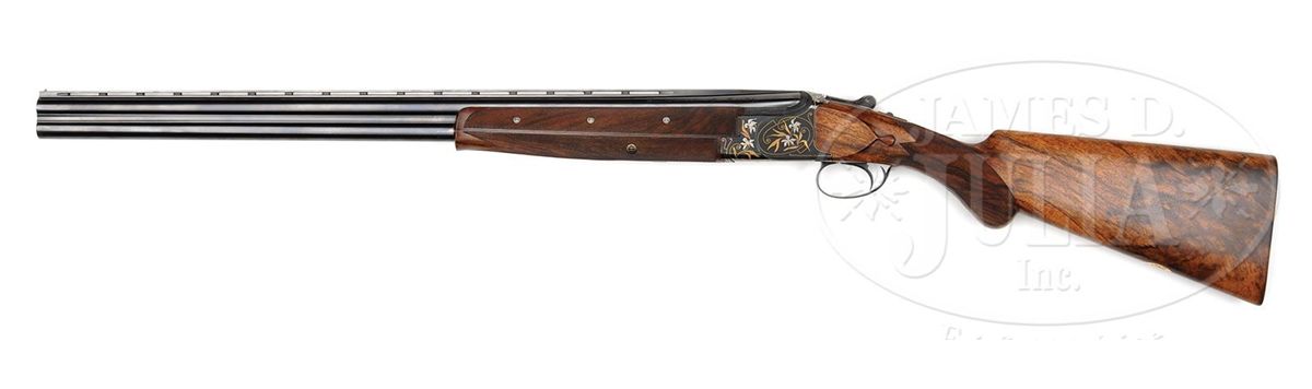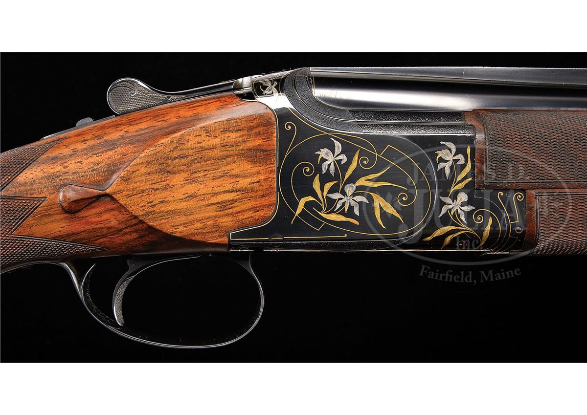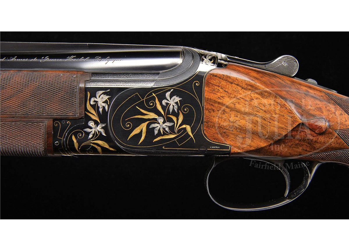 SN 42763 S5. Cal. 12 ga. 2-3/4" Chambers. This specially made and exquisitely finished superposed has 28" ventilated rib bbls, hand engraved "Fabrique Nationale d' Armes de Guerre Herstal. Belgique" on left side of top bbl. MOD/FULL choke markings are present under ejectors. Beautifully polished and sculpted, blued, superposed action is engraved with exceptionally well done, multi-hued, gold inlay of orchids and leaves; flowers are in white gold with yellow gold pistils, leaves appear to be a sublime mixture of yellow, red, and green gold adding to perceived depth. Floral elements are surrounded by large, open, scrolled, wire inlay. All inlays are flush, but leaves and flowers are given additional depth by very well done Bulino shading. This fine inlay extends over bottom of action and onto trigger guard, as well as top lever. This truly masterful work is by noted FN engraver, A. Watrin, whose signature appears at the bottom right of left side of action. Gun is fitted with specially filed, checkered, blued trigger. Beautifully marbled, classically laid out European walnut long tang, round knob buttstock with carved drop points and point pattern checkering at grip, measures 14-3/4" over skip line checkered butt. A gold oval on toe line is engraved with script initials "H M" (Hassan Morocco ?). Well matching three piece forend has schnabeled tip. Bore diameter: top -.724, bottom -.725. Bore restrictions: top -.038 (Full), bottom -.024 (Mod). Drop at heel: 2-3/8", drop at comb: 1-7/16". Weight: 7 lbs. 7 oz. LOP: 14-3/4". Another of the King's guns is also in this auction. PROVENANCE: Information on Hassan II and history of this gun stating that it was made in 1965 and "These two guns were a present from King Hassan II of Morocco. I was a great friend of the kings and made many trips to his country as his private barber." "These guns were a gift from the King to me." CONDITION: Excellent. Metal parts retain essentially all of their beautifully polished high gloss finishes with some light scratches at bottom of action around front lump mortise. Extensions at rear portion of mortise are slightly bent. Stocks retain essentially all of their hand rubbed oil finish with one or two minor handling marks. Bores are excellent. Mechanically crisp. A truly stunning gun. 4-49173 MGM256