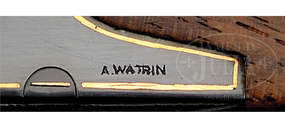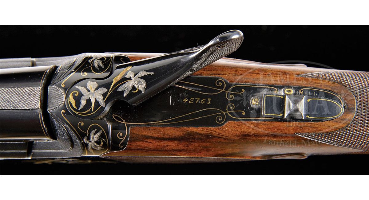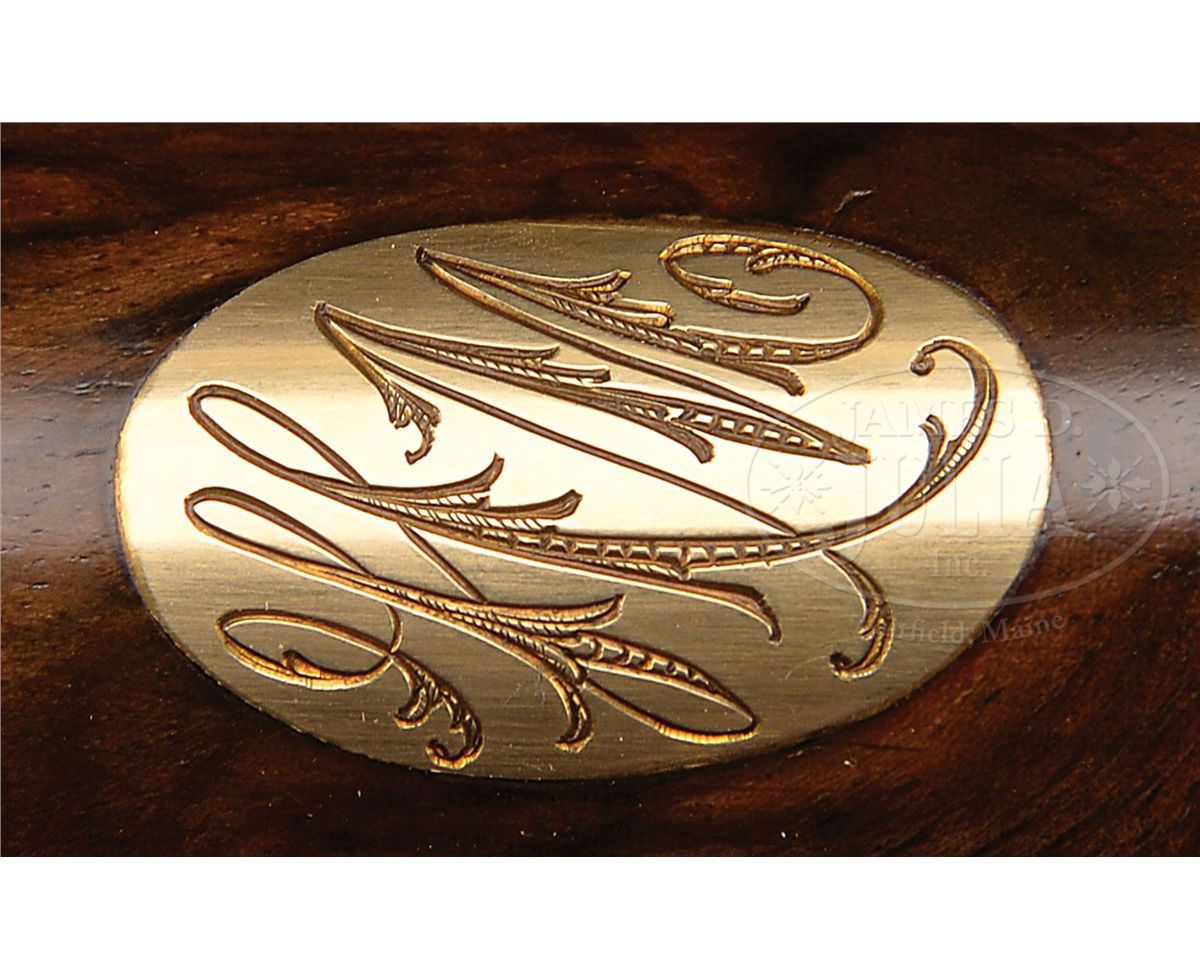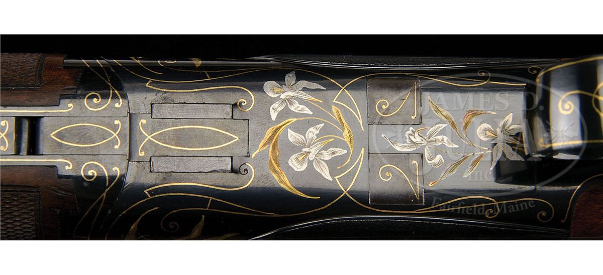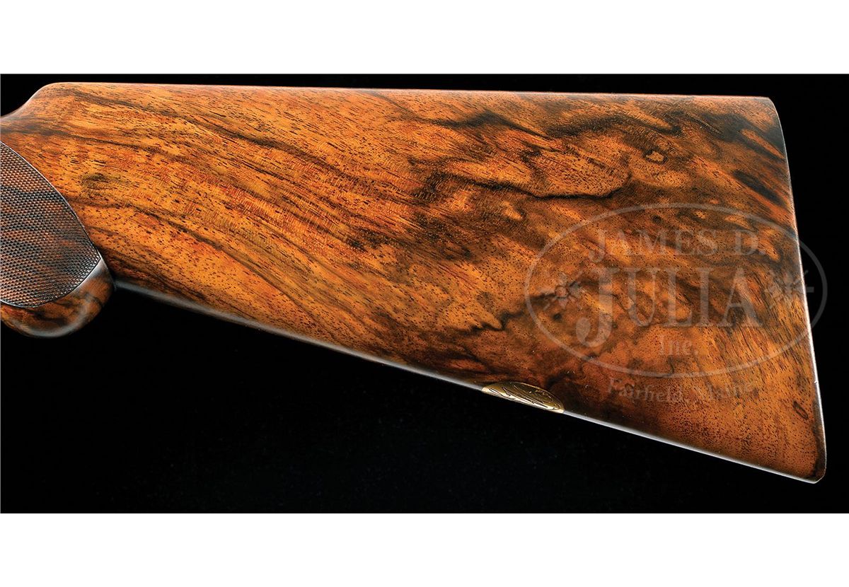 SN 42763 S5. Cal. 12 ga. 2-3/4" Chambers. This specially made and exquisitely finished superposed has 28" ventilated rib bbls, hand engraved "Fabrique Nationale d' Armes de Guerre Herstal. Belgique" on left side of top bbl. MOD/FULL choke markings are present under ejectors. Beautifully polished and sculpted, blued, superposed action is engraved with exceptionally well done, multi-hued, gold inlay of orchids and leaves; flowers are in white gold with yellow gold pistils, leaves appear to be a sublime mixture of yellow, red, and green gold adding to perceived depth. Floral elements are surrounded by large, open, scrolled, wire inlay. All inlays are flush, but leaves and flowers are given additional depth by very well done Bulino shading. This fine inlay extends over bottom of action and onto trigger guard, as well as top lever. This truly masterful work is by noted FN engraver, A. Watrin, whose signature appears at the bottom right of left side of action. Gun is fitted with specially filed, checkered, blued trigger. Beautifully marbled, classically laid out European walnut long tang, round knob buttstock with carved drop points and point pattern checkering at grip, measures 14-3/4" over skip line checkered butt. A gold oval on toe line is engraved with script initials "H M" (Hassan Morocco ?). Well matching three piece forend has schnabeled tip. Bore diameter: top -.724, bottom -.725. Bore restrictions: top -.038 (Full), bottom -.024 (Mod). Drop at heel: 2-3/8", drop at comb: 1-7/16". Weight: 7 lbs. 7 oz. LOP: 14-3/4". Another of the King's guns is also in this auction. PROVENANCE: Information on Hassan II and history of this gun stating that it was made in 1965 and "These two guns were a present from King Hassan II of Morocco. I was a great friend of the kings and made many trips to his country as his private barber." "These guns were a gift from the King to me." CONDITION: Excellent. Metal parts retain essentially all of their beautifully polished high gloss finishes with some light scratches at bottom of action around front lump mortise. Extensions at rear portion of mortise are slightly bent. Stocks retain essentially all of their hand rubbed oil finish with one or two minor handling marks. Bores are excellent. Mechanically crisp. A truly stunning gun. 4-49173 MGM256