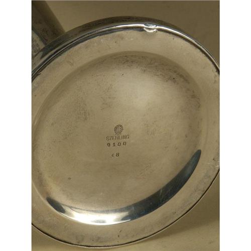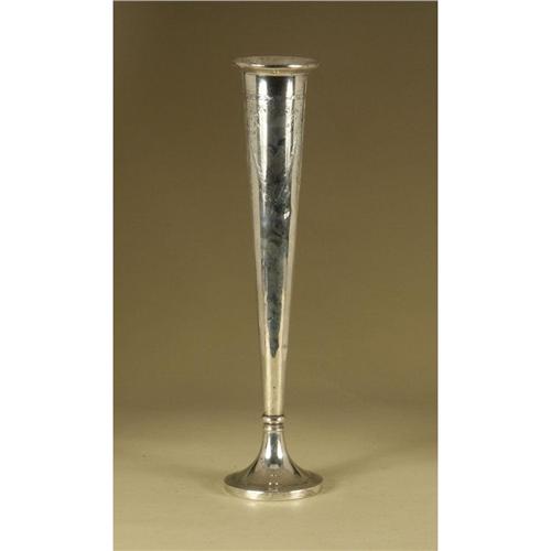 STERLING: A sterling trumpet shaped vase having weighted base, 18'' tall, 4'' at the base, around the top are incised wedge shaped shields surrounded by a wreath of fauna, hallmarked Watson Company, Atteboro, Massachusetts, now part of Wallace Silversmiths. The mark indicates the vase was made between 1905-1929, multiple surface indentations and minor surface scrathes noted.