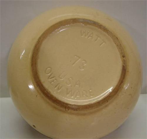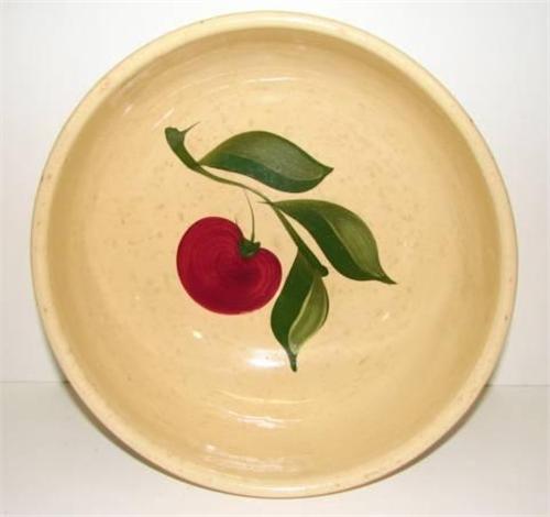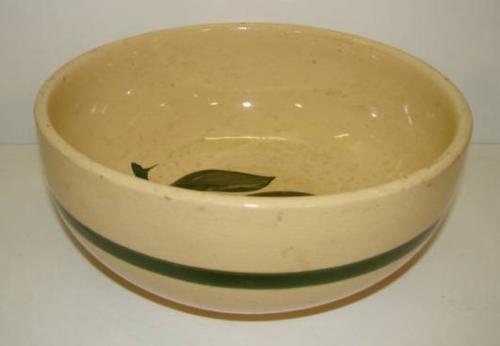 WATT APPLE DECORATED BOWL. Shows major signs of crazing throughout. Shows roughness along bottom of base. Decorated with apple decoration on interior of bowl and single green band decoration on exterior. Marked on bottom “73”. 4” H, 9.5” Dia.