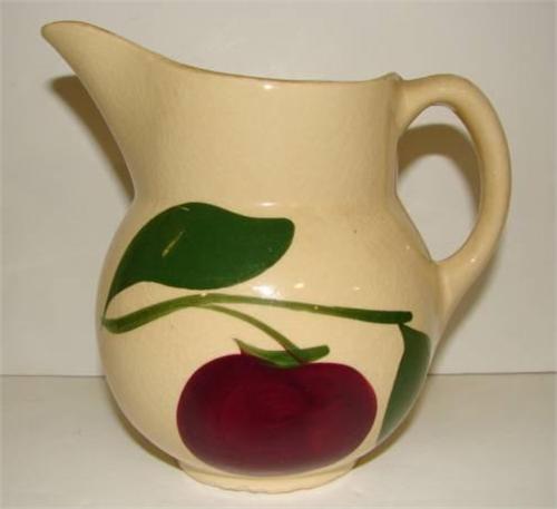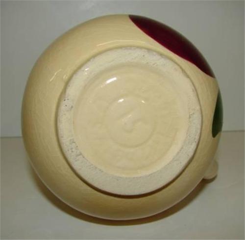 WATT APPLE DECORATED CREAM PITCHER. Shows crazing throughout. Shows chipping along bottom of base. Marked on bottom “15”. 5.5” H