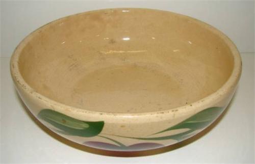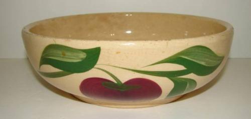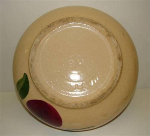 WATT APPLE DECORATED LOW BOWL. Shows major signs of crazing throughout. Decorated with apple decoration on exterior. Marked on bottom “96”. 2.75” H, 8.5” Dia.
