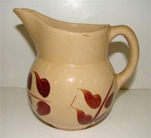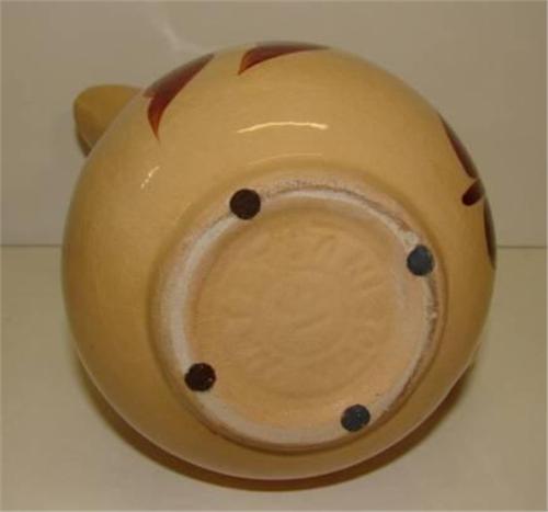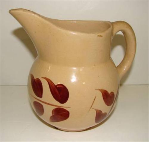 WATT FLORAL DECORATED CREAM PITCHER. Shows crazing throughout with minor roughness at spout. Marked on bottom “15”. 5.5” H