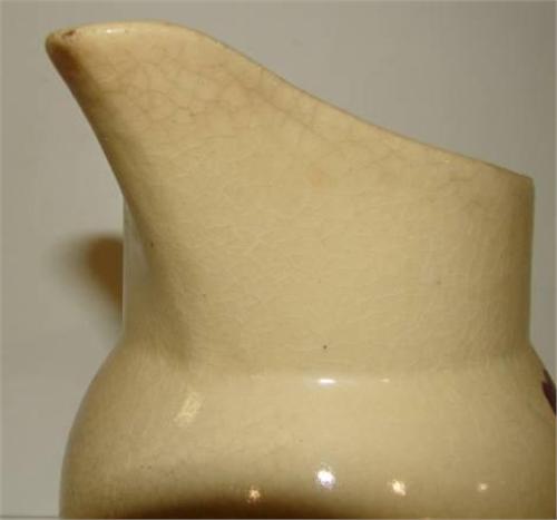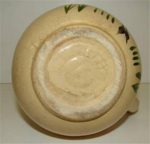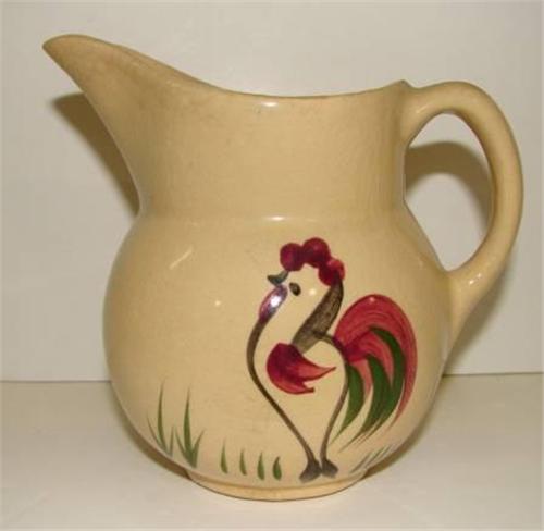WATT ROOSTER DECORATED PITCHER. Shows crazing throughout. Shows minor chipping at spout. Marked on bottom “16”. 5.5” H