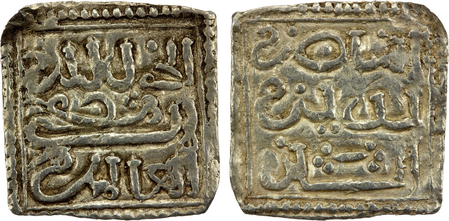 WATTASID: Nasir al-Din Muhammad, 1545-1549, AR square ½ dirham (0.65g), NM, ND, A-551-var, legends al-hamdu lillah / rabb / al-'alamayn // al-Nasir / li-din / Allah, tentative attribution, but the style and decorations seem appropriate for this time; unpublished and probably unique, VF-EF.
