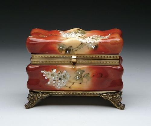 WAVE CREST BOX. Beautiful egg crate box is enameled with lovely floral design against a background of burnt orange at the ends shading to creamy yellow at the center. Box rests on metal base with lion head feet. Inside is lined with lined satin. Marked on the underside "Wave Crest". SIZE: 7 in. x 3-3/4 in. x 5 in. t. CONDITION: Metal base appears to have been reapplied, one hinge shows solder repair. 5-61193