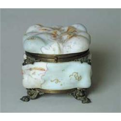 Lot 371 WAVE CREST EGG CRATE BOX. Blown-out egg crate mold with day lily decoration and original metal hardware. Unsigned. SIZE: 6-1/2” sq. x 6-1/2” t. CONDITION: Hinge is loose. 5-68468 (800-1,200)