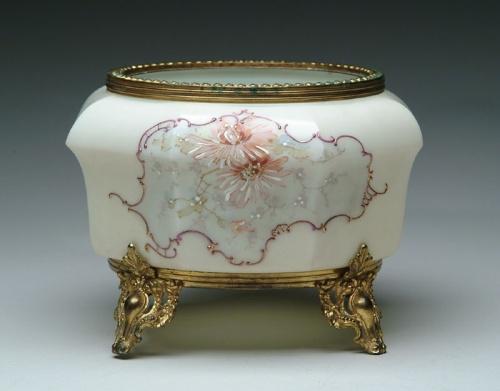 WAVE CREST FOOTED BOWL. Lovely large Wave Crest footed bowl has creamy background with large pink Zinnia-type flowers with white highlights with similar panel decorated on both sides. The top is fitted with a brass ring and the bottom is fitted with four ornate brass colored feet. Bowl retains a strong pink "Wave Crest" signature. SIZE: Approx. 8-1/4 in. dia x 6 in. t. CONDITION: Generally very good to excellent. 5-61500