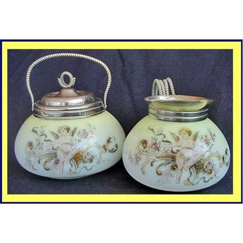 Matching pair of old black marked Wave Crest wiht cherub / putti decoration. USA 19th century.<BR>Creamer is 3 inches high, excluding the handle. The sugar bowl with silver plated lid is 4 1/4inches accross widest point.<BR>Both items are enhanced with pretty winged putti / cherubs, seated in a nest of flowers and scrolls. Silver plated mounts.<BR>The Black Wave Crest mark is the earliest mark. <BR>Good condition.