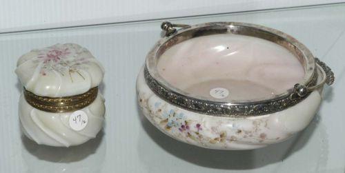 WAVECREST 7" BASKET together with a 3 1/2" WAVECREST BOX, early 20th century, CONDITION REPORT: basket lacking lid, box lacking catch and lining only fair. PACKING AND SHIPPING excl. insurance w/i Contintental U.S. $30