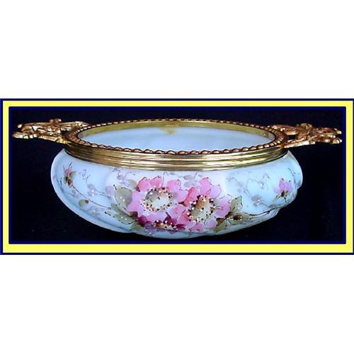 Wavecrest glass bowl with ormolu mounts. <BR>Measures almost 9 1/2inches accross from handle to handle and 2 1/2inches high.<BR>Folded, swirling glass in palest blue with beautiful and very delicate painting of flowers with enamel highlights. The rim consists of concentric ridges of very rich gold-coloured metal with scrolling waves moulded on the top and attached ormolu handles on either end. Fabulous detail and finest work from the glass to the painting and metalwork.<BR>Marked underneath with Wavecrest mark.<BR>Excellent condition - no damage/losses/fading of any sort.