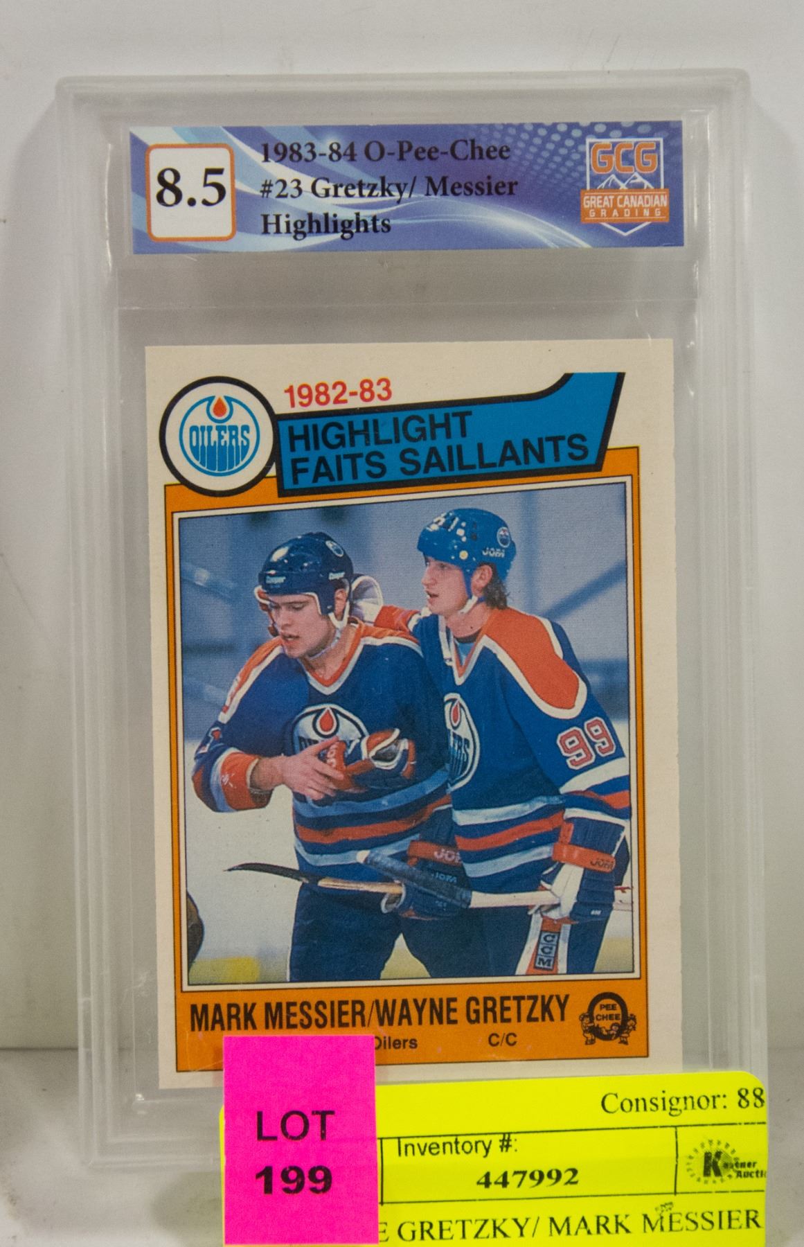 THIS WAYNE GRETZKY AND MARK MESSIER HIGHLIGHTS CARD IS FROM 1982-83 AND IS GRADED 8.5