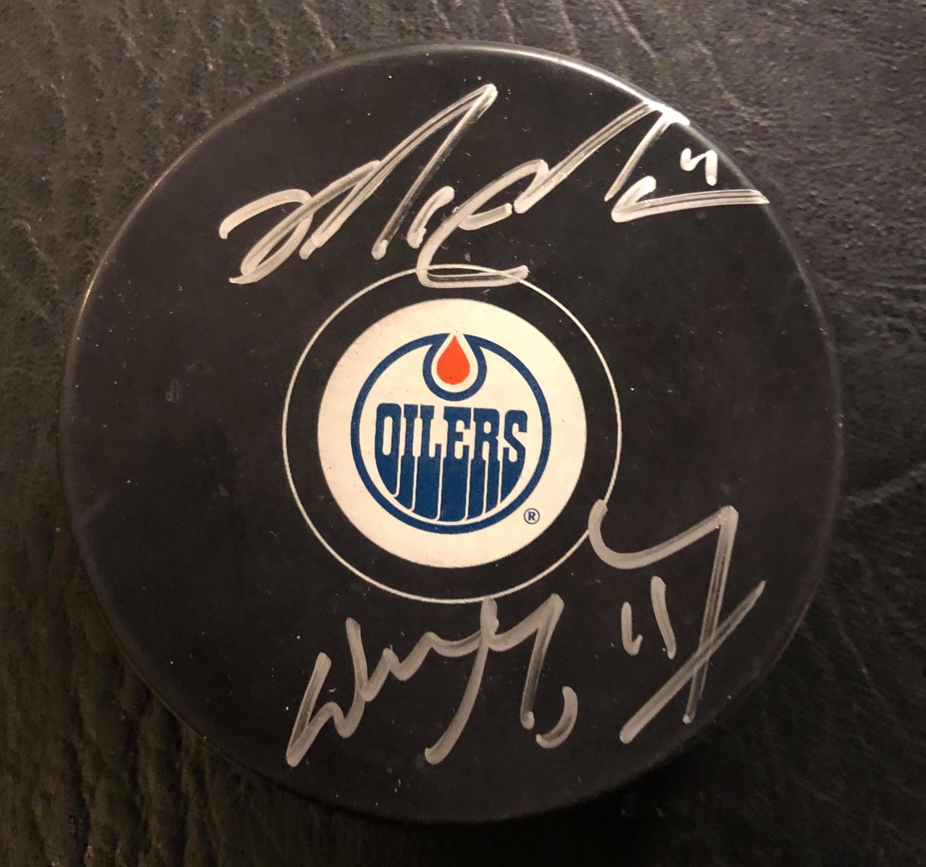 WAYNE GRETZKY & MARK MESSIER SIGNED OILERS LOGO HOCKEY PUCK (GLOBAL AUTHENTICS COA)