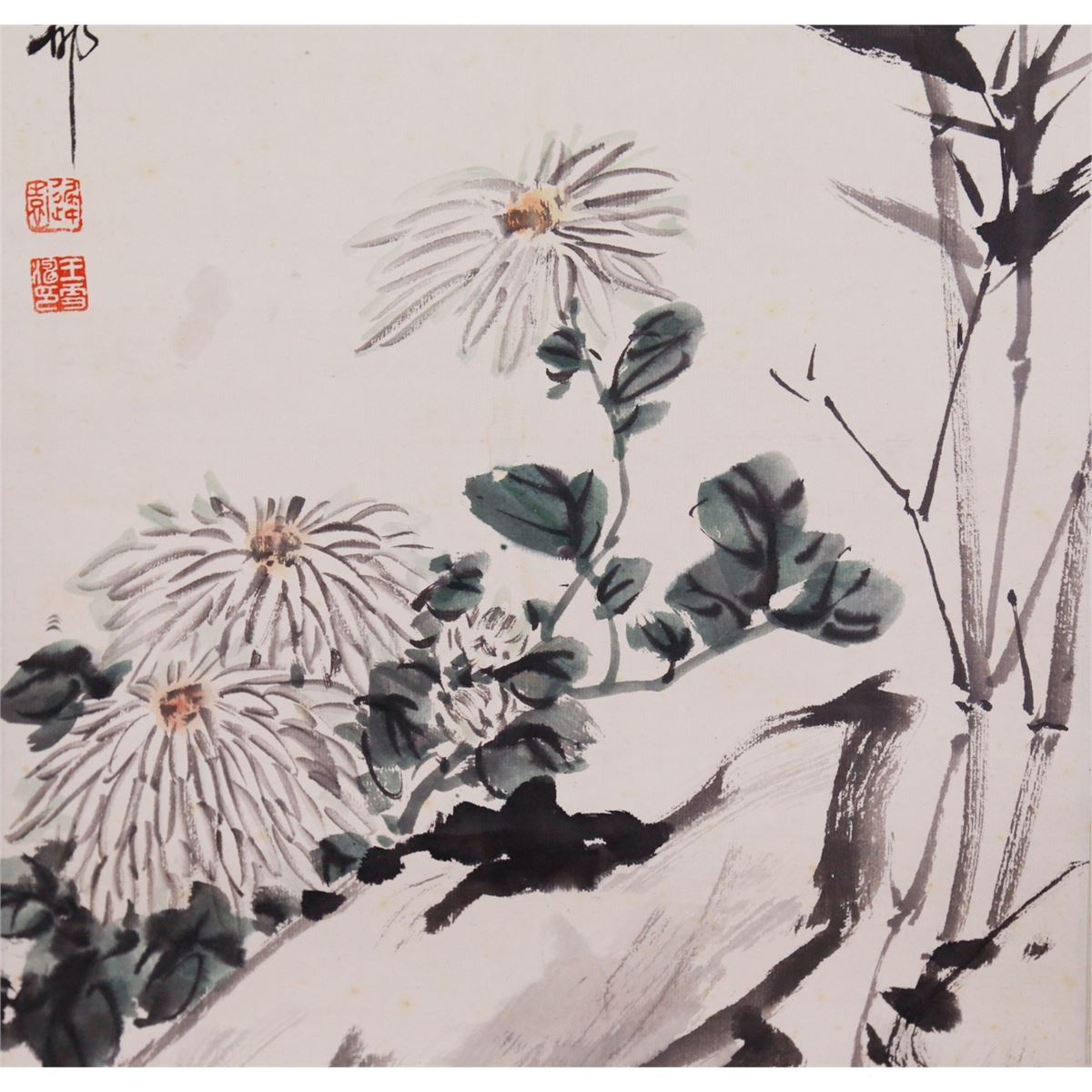 Bamboo, chrysanthemum, birds and insects; Chinese ink and watercolour on paper; hanging scroll; signed Wang Xuetao and inscribed with three artist seals; 132 cm x 34 cm