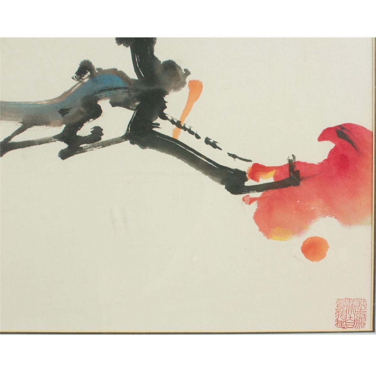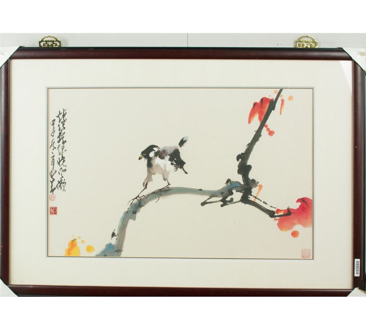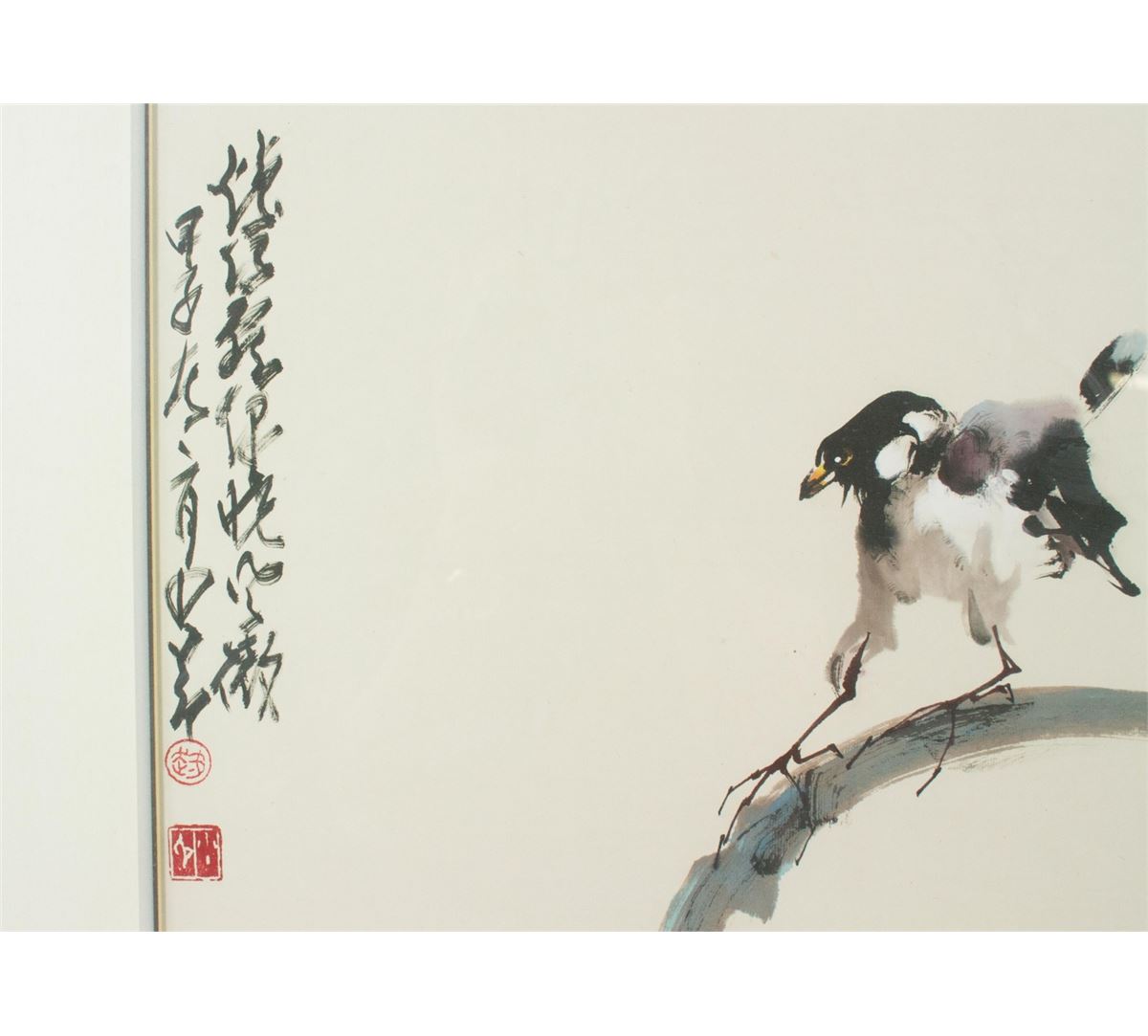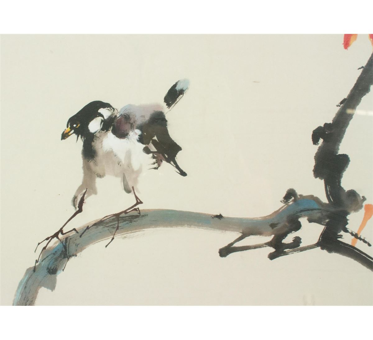 Bird on plum blossom branches, Chinese ink and watercolour on paper, framed, signed and sealed by Zhao Shao'ang. 46cm X 68cm; 66cm X 94cm (with frame)