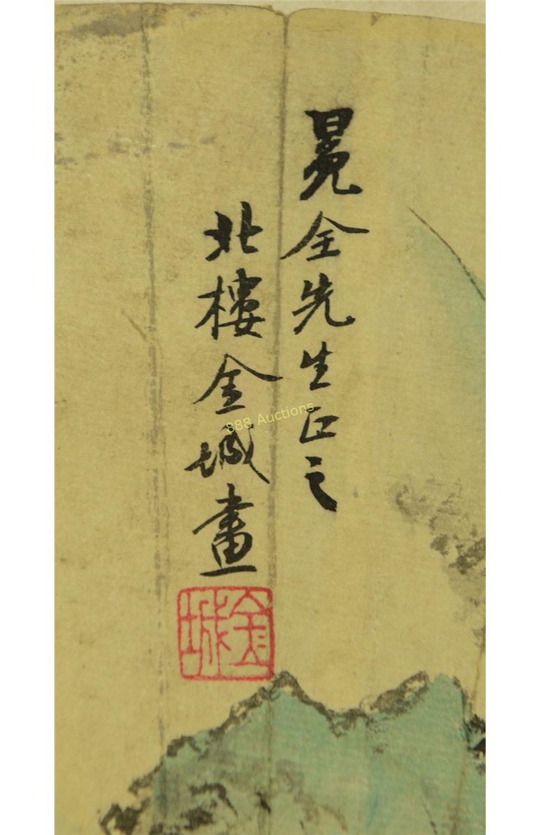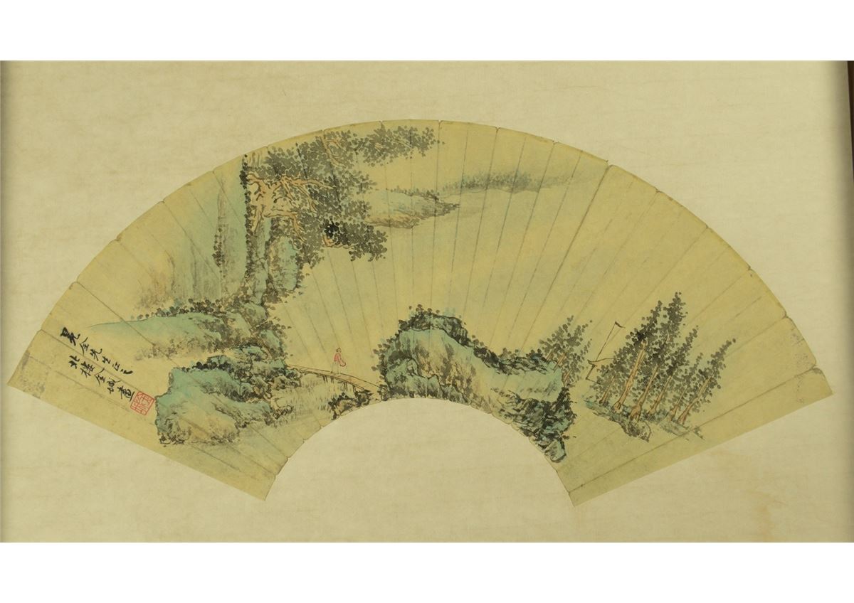 Sage crossing bridge, fan painting, Chinese ink and watercolour on paper, signed Mian Quan with one red seal. 18.5 cm x 53 cm.