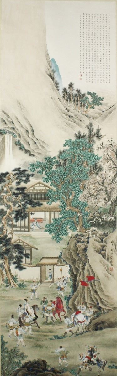 Figures and landscape; Chinese ink and watercolour on paper; signed Xu Cao and inscribed with three artist seals; 165 cm X 48 cm