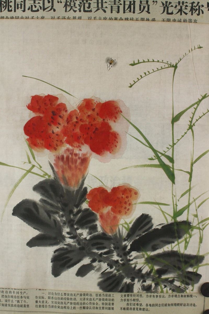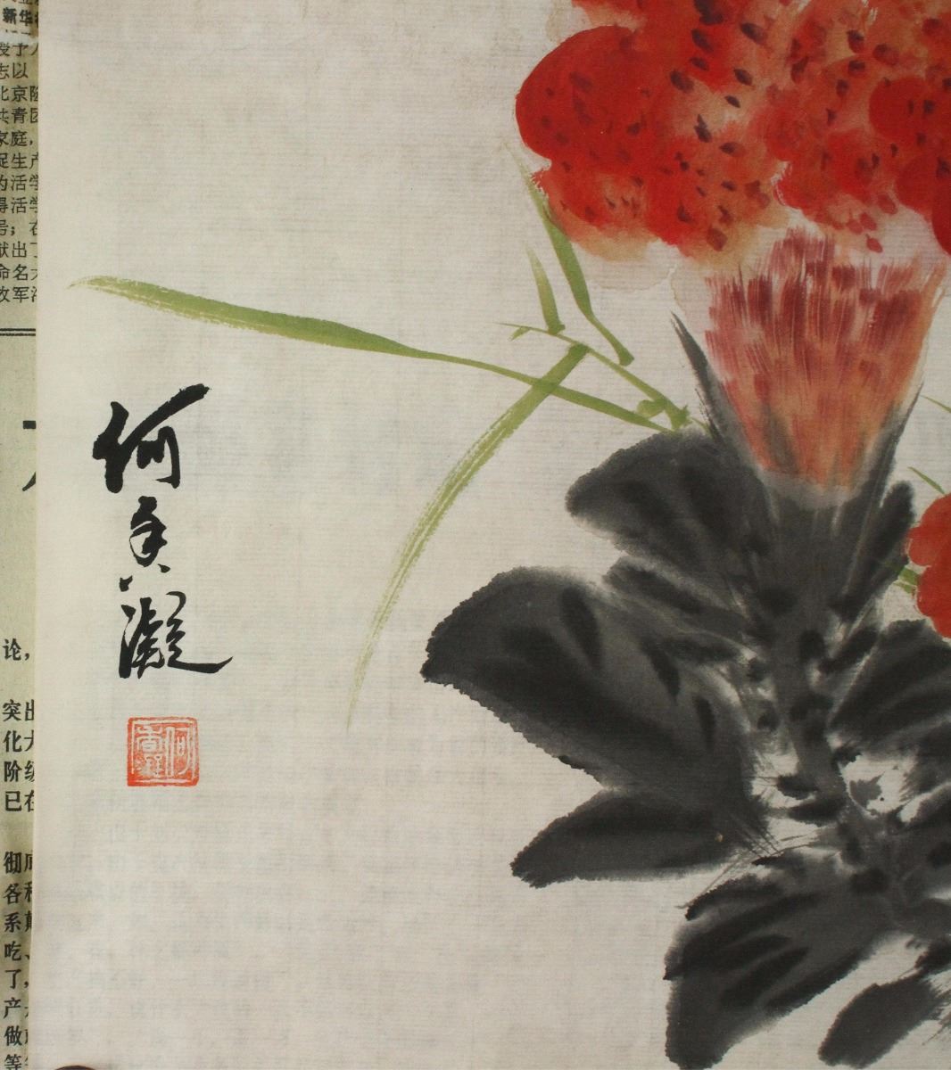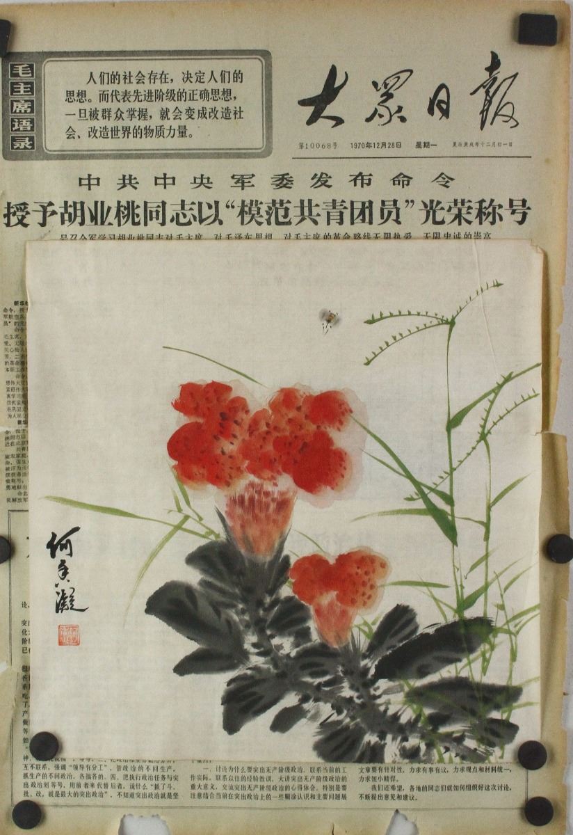 Flowers; Chinese ink and watercolour on paper; along with 1970 newspaper; signed He Xiangning and inscribed with an artist seal; 34.5 cm X 34.5 cm