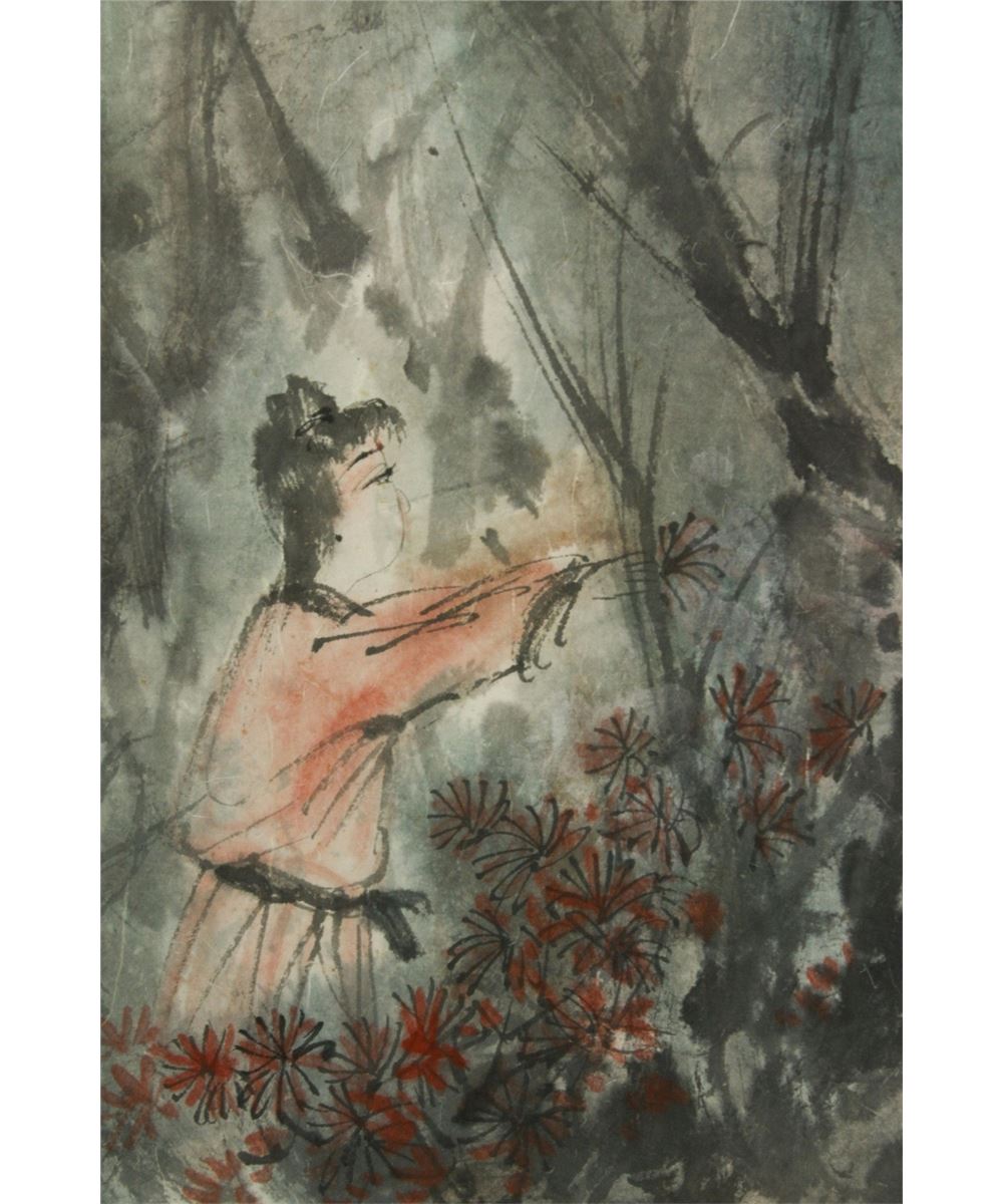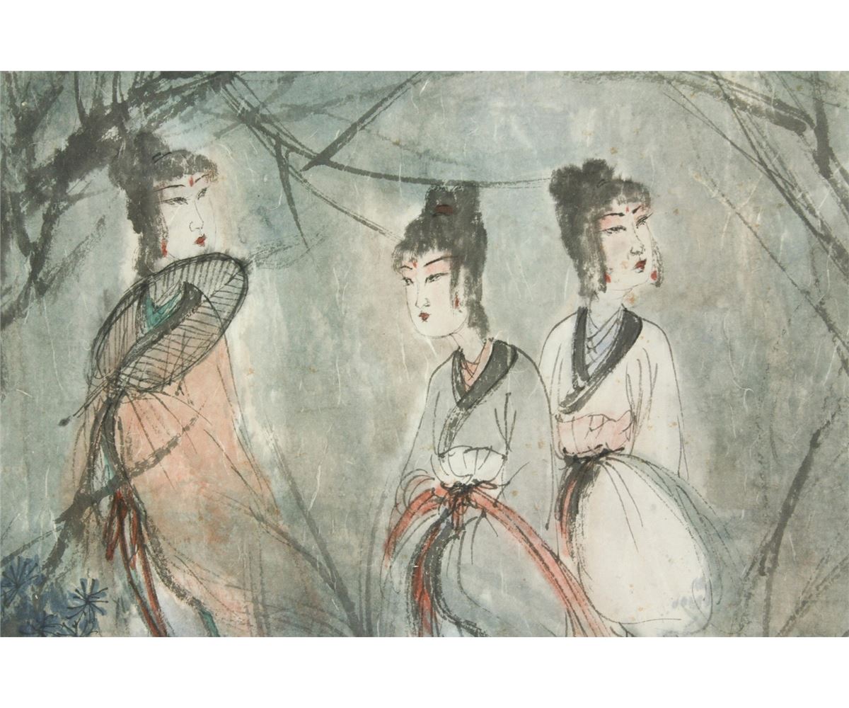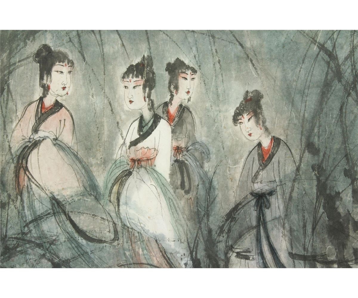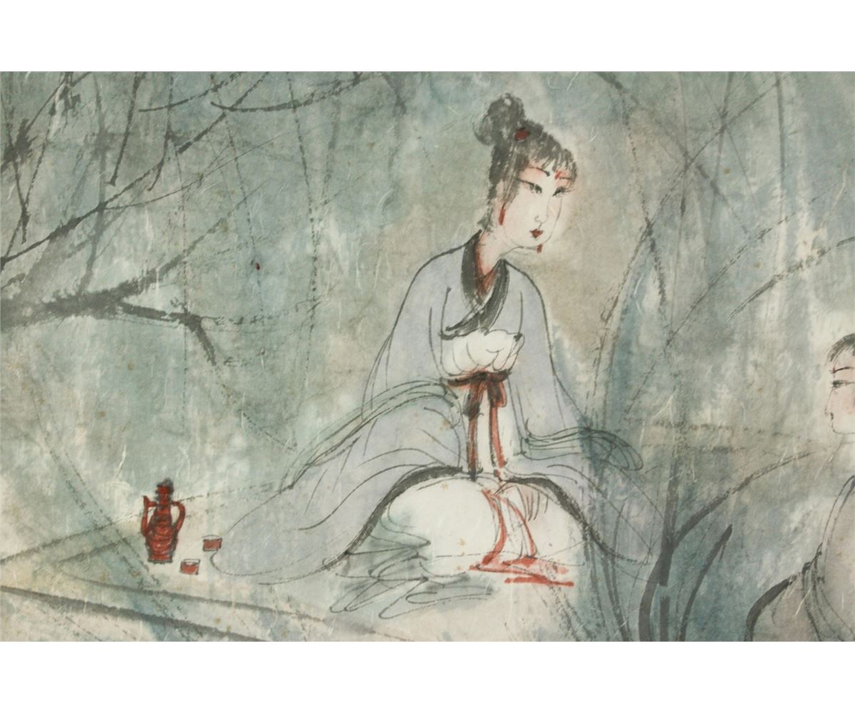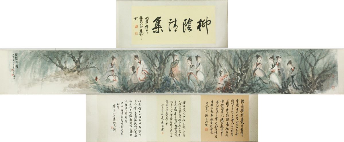Figures in the woods; Chinese ink and watercolour on paper; hand scroll; signed Fu Baoshi and inscribed with two artist seals; 30 cm X 65 cm, 36.5 cm X 276.5 cm, 36.5 cm X 37.5 cm, 36.5 cm X 26.5 cm, 36.5 cm X 30 cm