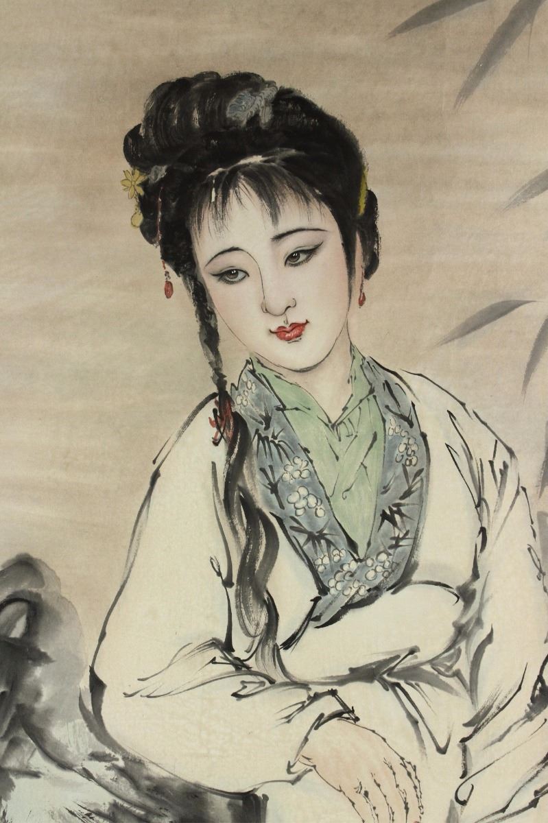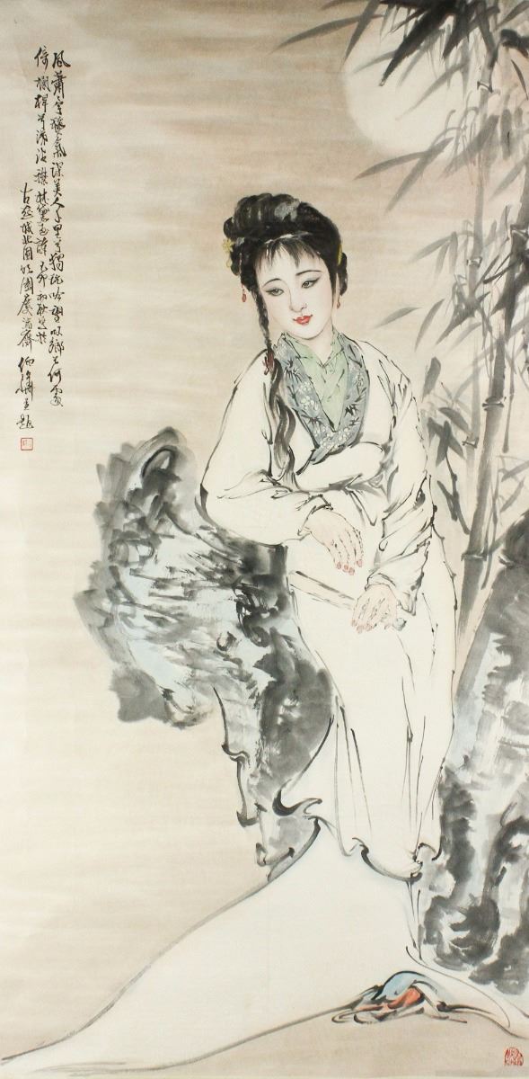 Portrait of Ling Daiyu; Chinese ink and watercolour on paper; signed Ren Bonian and inscribed with two artist seals; 168 cm X 83 cm