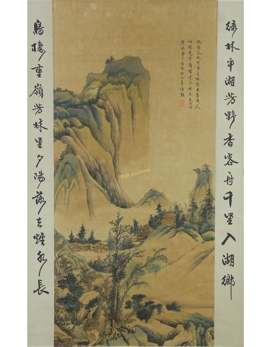 Landscape and calligraphy; Chinese ink and watercolour on paper; hanging scroll; signed Ren Xiong and inscribed with one artist seal; 55 cm x 100 cm
