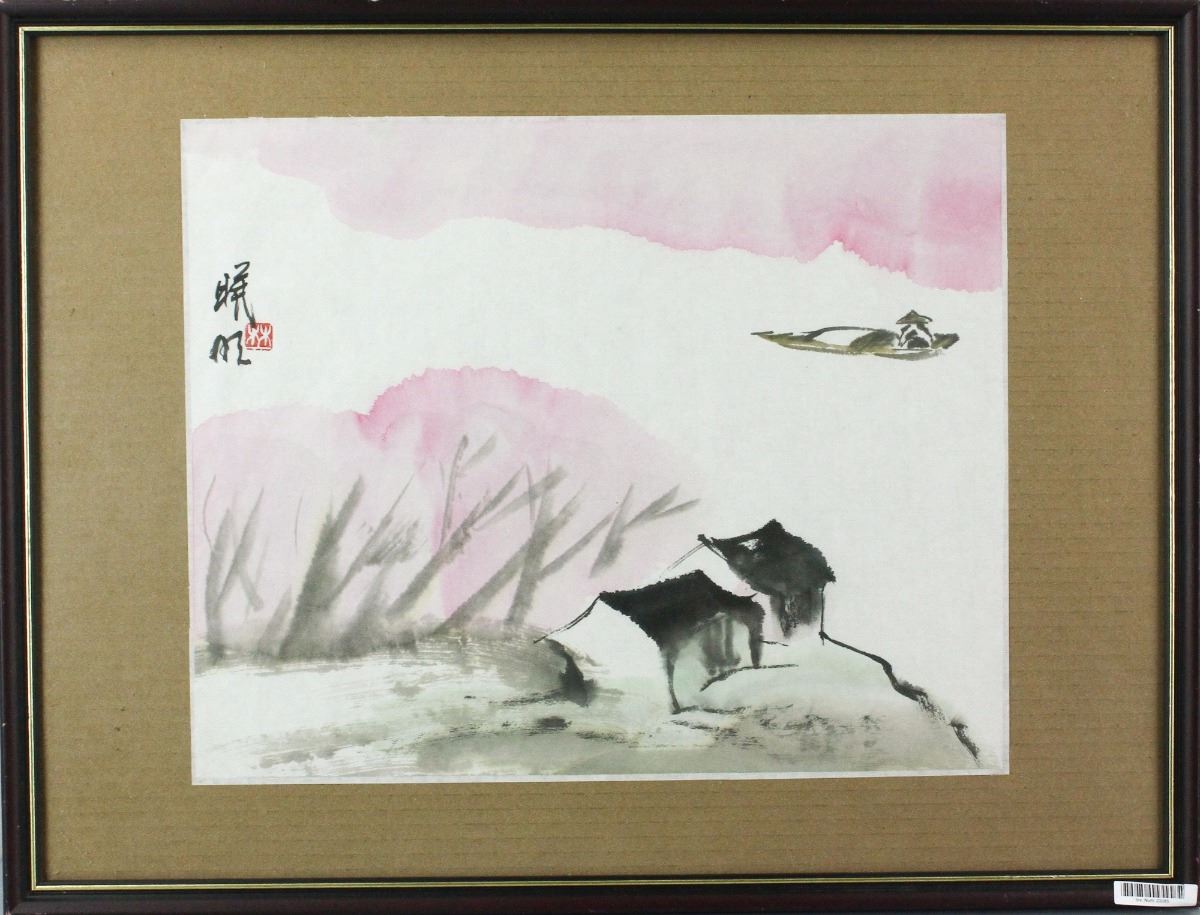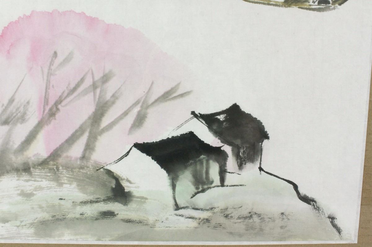 Village under sunset; Chinese ink and watercolour on paper; framed; signed and inscribed with one artist seal; 49 cm X 64 cm