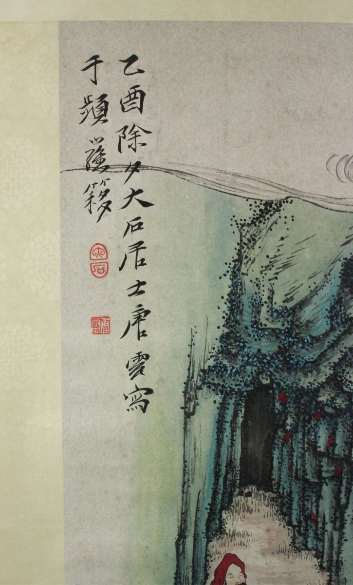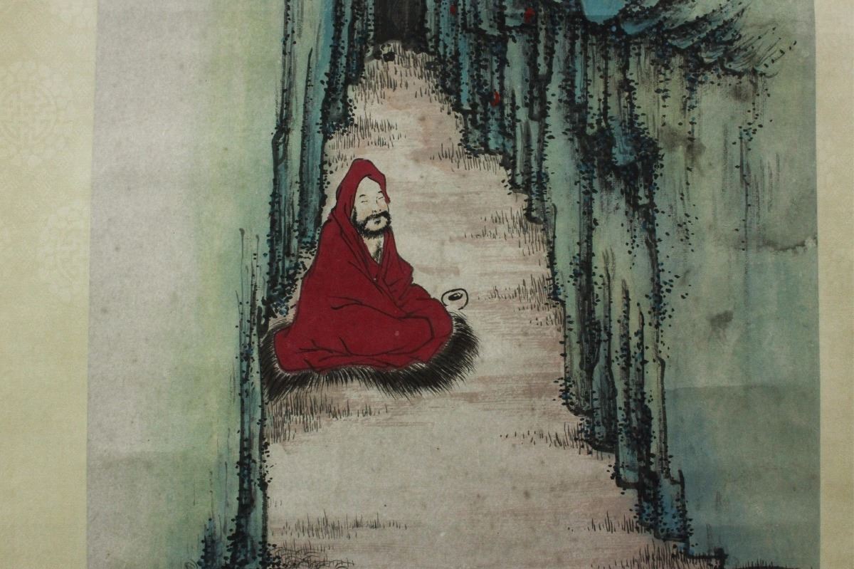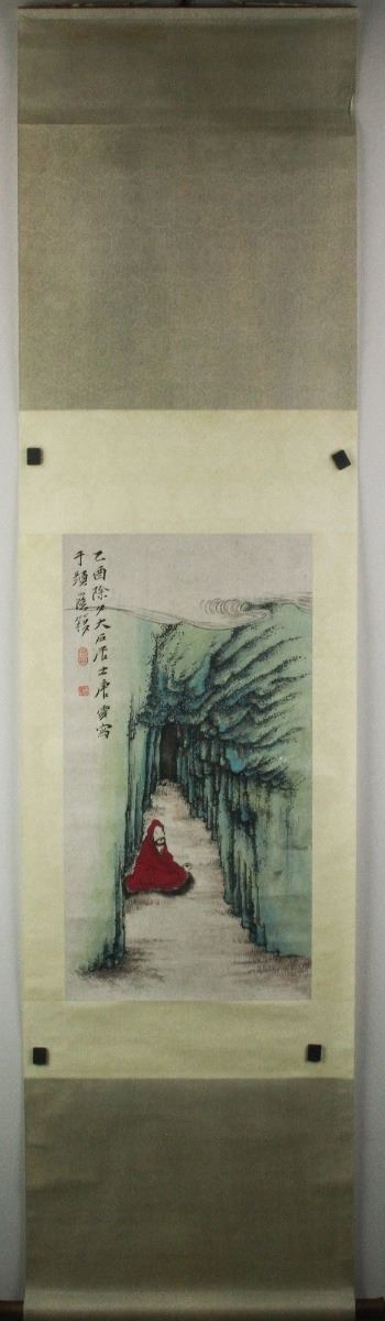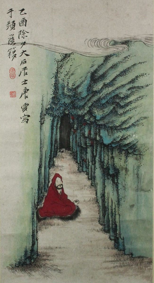 Arhat in forest; Chinese ink and watercolour on paper; hanging scroll; signed Tang Yun and inscribed with two artist seals; 194 cm X 48 cm