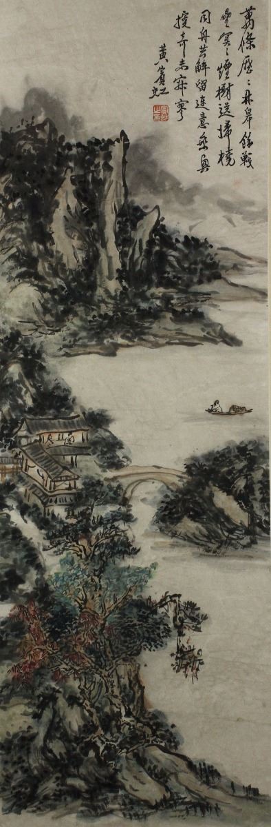 Village scenery; along with script calligraphy; Chinese ink and watercolour on paper; signed Huang Binhong and inscribed with one artist seal; 128 cm X 51 cm