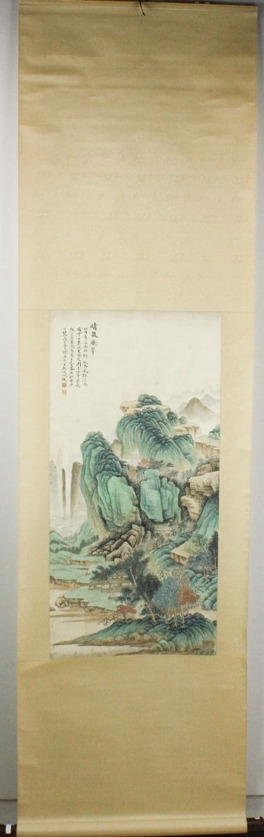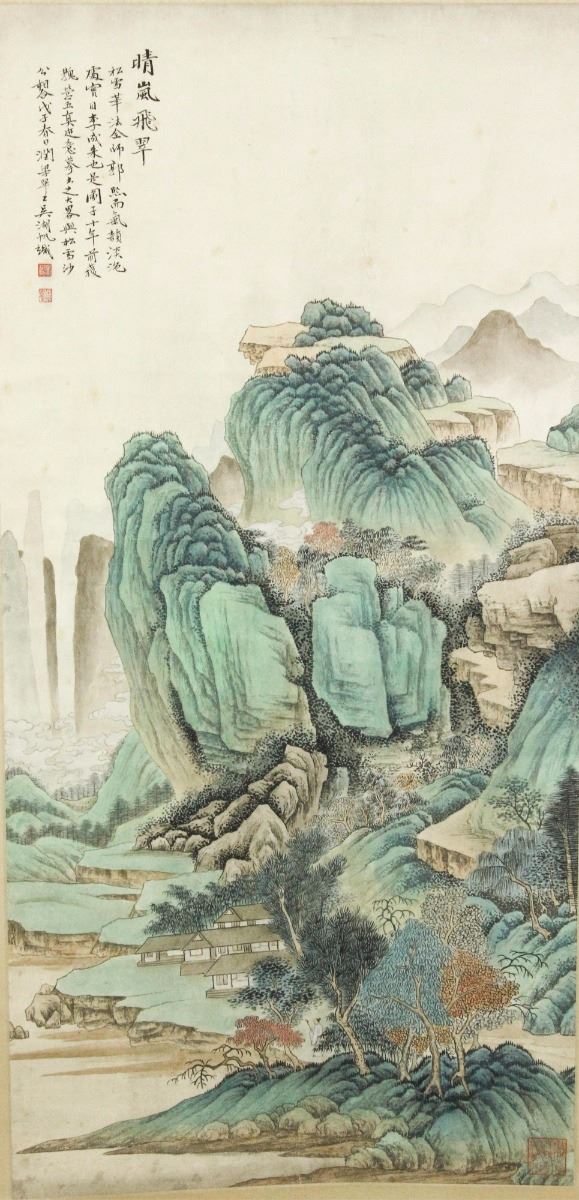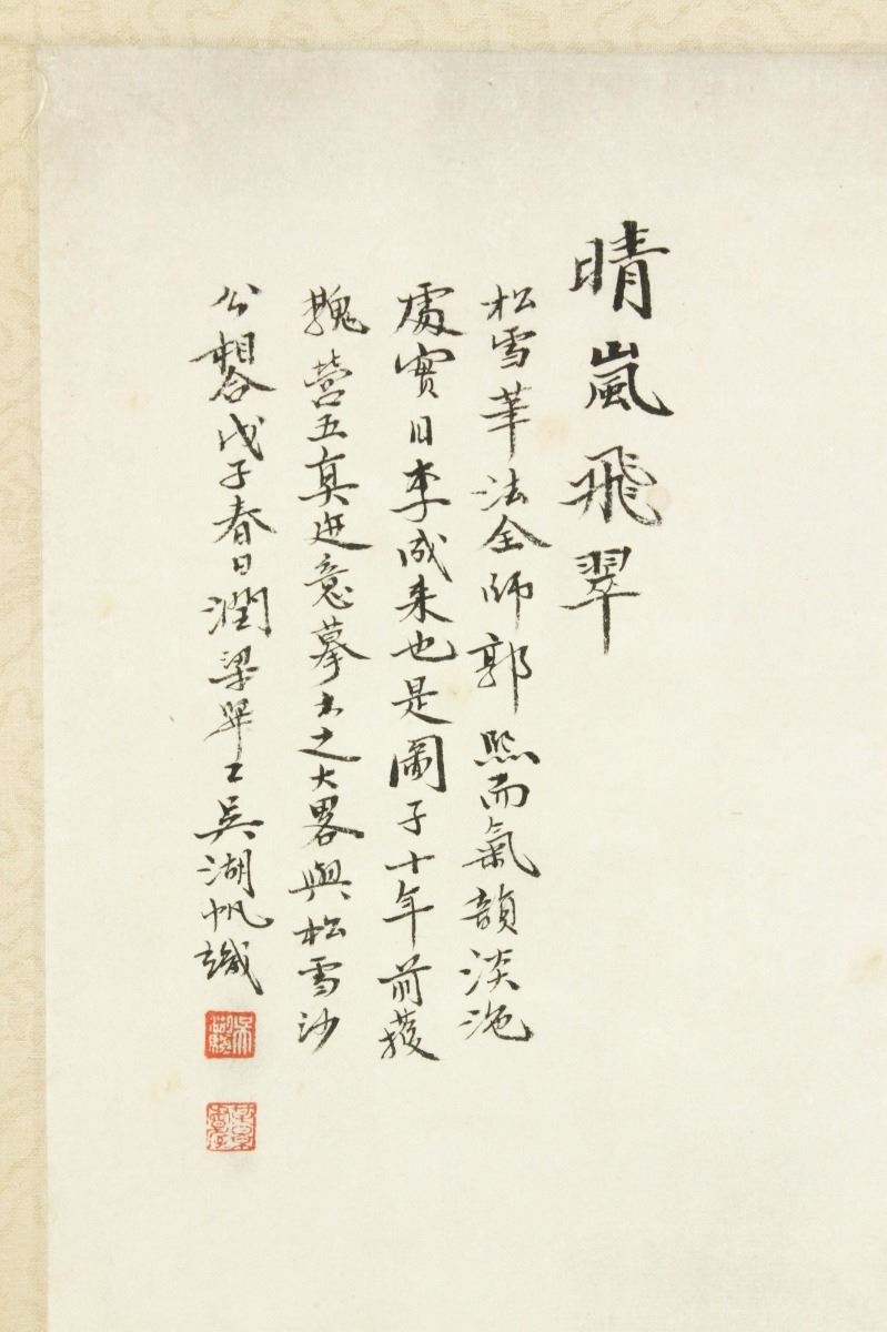 Mountains and houses; along with script calligraphy; Chinese ink and watercolour on paper; hanging scroll; signed Wu Hufan and inscribed with three artist seals; 89.5 cm X 43 cm